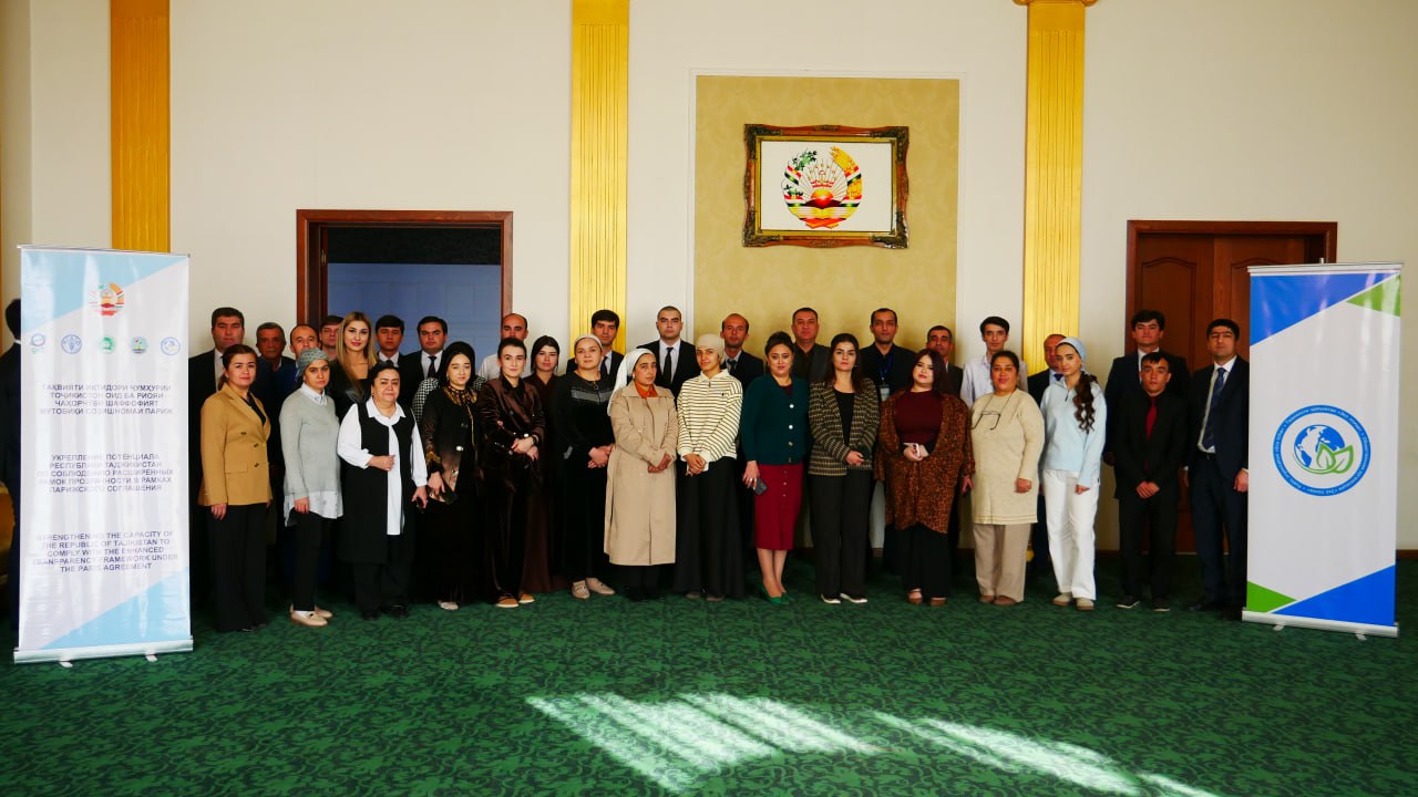 Рӯзҳои 18–21 ноябри соли ҷорӣ Агентии обуҳавошиносии Кумитаи ҳифзи муҳити зисти назди Ҳукумати Ҷумҳурии Тоҷикистон дар ҳамкорӣ бо Намояндагии Ташкилоти озуқа ва кишоварзии Созмони Милали Муттаҳид (ФАО) дар Ҷумҳурии Тоҷикистон ва Фонди умумиҷаҳонии экологӣ омӯзиш (тренинг)-и миллӣ оид ба мавзӯъҳои ӯҳдадориҳои ҷумҳурӣ дар доираи Созишномаи Париж, Саҳмҳои дар сатҳи миллӣ муайяншуда (ССММ/NDC), барӯйхатгири (инвентаризатсия)-и газҳои гулхонаӣ, Системаи шаффофият (ETF/MVR), Ҳисоботи дусолаи шаффофият (BTR) ва ҳисоботи миллӣ тибқи Конвенсияи қолабии СММ оид ба тағйирёбии иқлим ва дигар масъалаҳои марбут ба тағйирёбии иқлимро бо иштироки намояндагони вазорату идораҳои дахлдори ҷумҳурӣ баргузор намуд.
